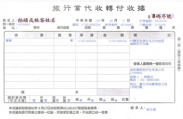 依據財政部規定,因為旅行業為特殊行業,僅提供代買代售的服務,只有轉手業務沒有實際的物品買賣,所以不是開發票喔~只能開立『蓋有公司統一發票章的代收轉付收據』(簡稱代轉),有些沒蓋發票章但是用系統出票,也是可以的。這張代轉雖然不能像統一發票那樣兌獎,但給公司報帳還是可以用的,大家不用擔心~